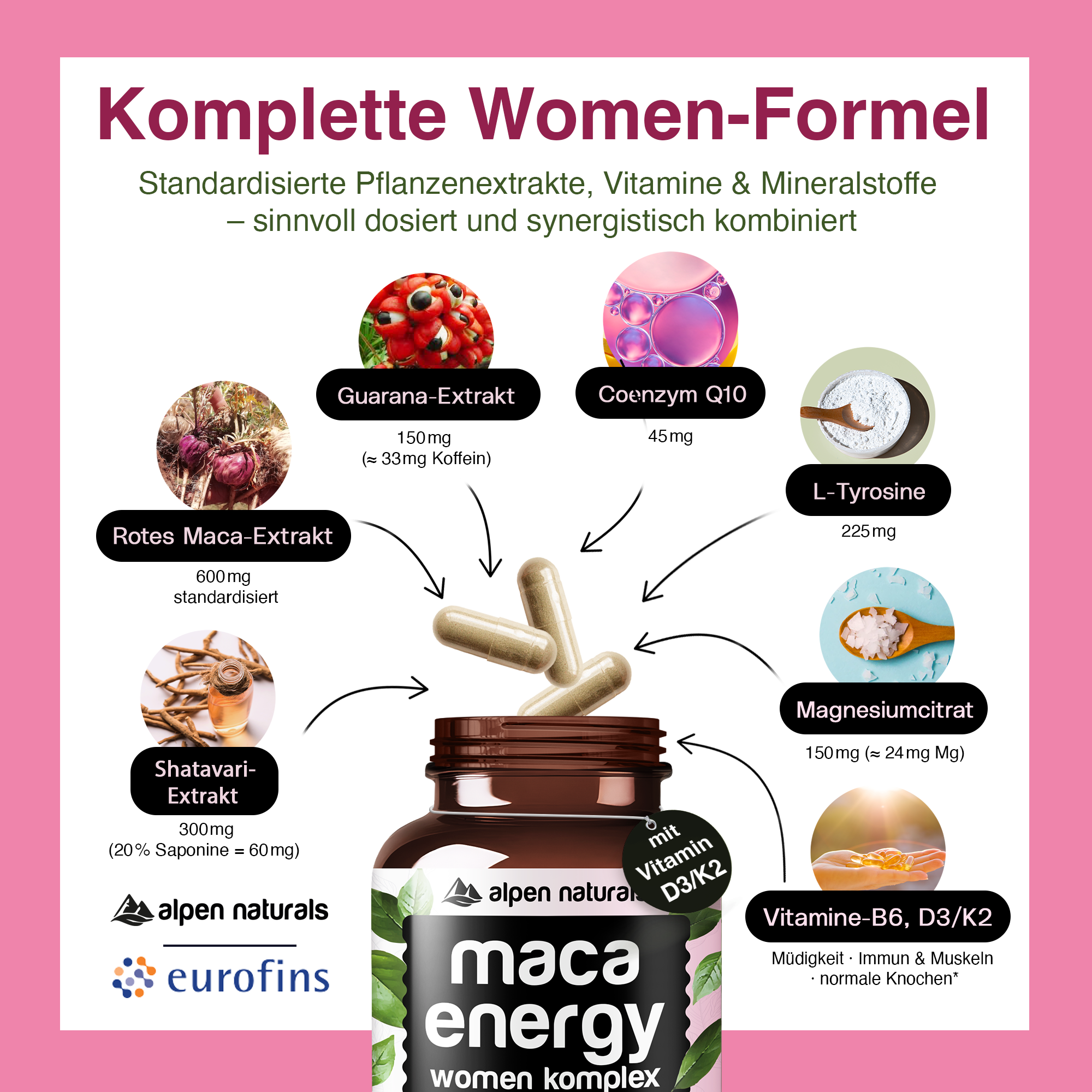 Maca root extract (red & yellow), dong quai extract, L-theanine, pyridoxal-5-phosphate (vitamin B6), folic acid, black pepper extract (piperine), capsule: hydroxypropylmethylcellulose.